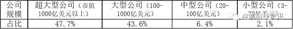 从被投资公司的规模来看,超大型公司(市值1000亿美元以上)占比47.7%、大型公司(100亿美元-1000亿美元)43.6%、中型公司(20亿-100亿美元)6.4%、小型公司(3亿-20亿美元)2.1%。因此,可以看出ARK Investment所投资的企业都是规模较大,比较成熟的上市公司。