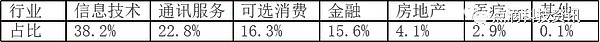 从细分行业来看,信息技术占比38.2%、通讯服务22.8%、可选消费品16.3%、金融15.6%、房地产4.1%、医疗2.9%、其他0.1%。