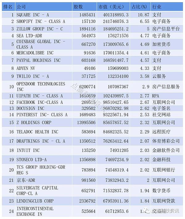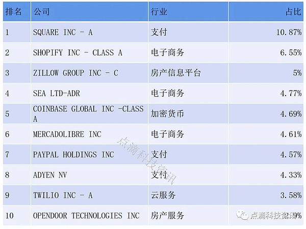 ARK金融科技创新基金的投资组合前十大持仓股票来看,持股公司涉及支付、电子商务、房产信息服务、加密货币和云服务等领域,前十大持仓股票分别为Square、Shopify、Zillow、Sea Ltd、Coinbase、Mercadolibre、Paypal、Adyen、Twilio、OPENDOOR TECHNOLOGIES,前十大持仓股票占比达到51.87%,超过一半。前十大重仓股中,电子商务公司有三家,分别是SHOPIFY INC、SEA LTD、MERCADOLIBRE INC,还有两家是房产服务平台,Zillow Group和OPENDOOR TECHNOLOGIES,另外有一家是云服务平台TWILIO。因此前十大重仓股中,严格意义上的金融科技公司只有4家,其中3家是支付公司,另外1家则是加密货币交易所公司,其余6家并非严格意义上的金融科技公司。