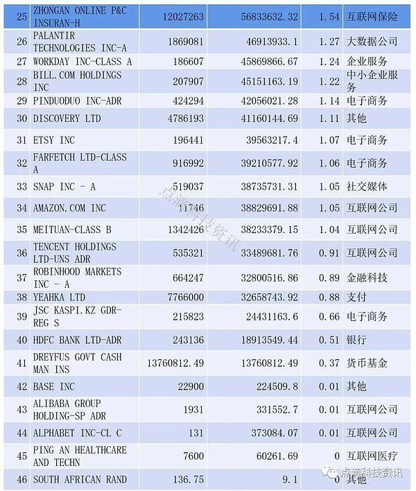 从具体投向来看,ARK金融科技创新基金投资的脸谱、亚马逊、美团、阿里巴巴、京东等互联网巨头公司占比为10.01%,阿里巴巴和谷歌母公司ALPHABET的占比分别仅为0.01%,电子商务公司投资占比为19.86%。因此,互联网巨头和电子商务公司的占比非常高!