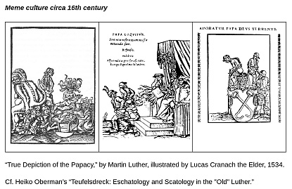 蓬勃发展的艺术社区的产量势不可挡——绕过了中世纪当局的许可控制——事实证明,作品广受欢迎并激发了其创造力。早期的印刷品是手写版的复制品,但艺术家们几乎即刻与技术互动,创造出新的艺术类型。大型视觉作品、小册子或海报以带有相关标题或标语的大字体排版为主的图像为特色。这些大版面可被理解为“模因”,即带有满载符号功能的标语的图像,可以病毒式地传播思想。这种新的艺术形式主导了市场,艺术家迅速创建了纲要、引文、对话和“混搭”。艺术家与印刷厂、作者和印刷工匠之间形成合作网络,创造了一个良性经济循环,不仅满足了最初的需求,而且创造了额外的、广泛的大众需求。其结果是寒武纪创造力爆发,在经济与艺术相遇的过程中,艺术家接纳了一种新技术及其新兴市场所特有的一种新型媒体。