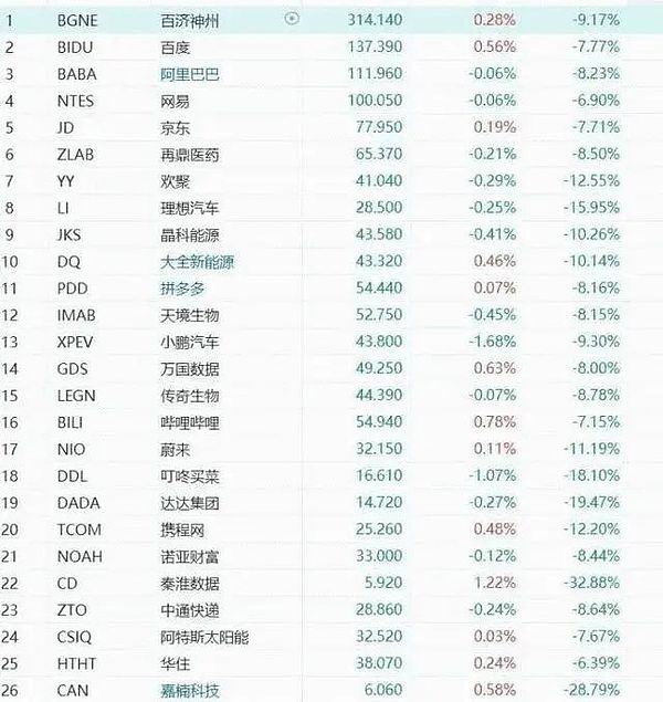 截至周五收盘知名中概股表现