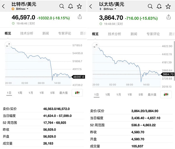 截至12月4日晚7时40分左右,比特币报价约46500美元/枚,24小时下跌超18%;以太坊报约3850美元/枚,24小时跌幅约16%。此外,EOS币跌逾28%、艾达币跌逾22%、门罗币跌逾20%、狗狗币跌逾22%、币安币(BNB)跌近13%。