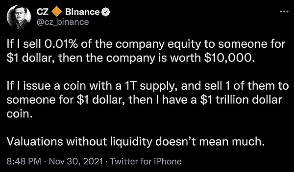 不过,11月30日,赵长鹏在社交媒体发布信息称,如果将公司权益的0.01%以1美元卖出,是否公司就值1万美元;如果发行1万亿总量的货币,并以1美元售出一个代币,是否他就有1万亿美元价值的币。并在其后评论,没有流动性的估值不意味什么。疑似回应有关登顶华人新首富身价900亿美元的热搜。