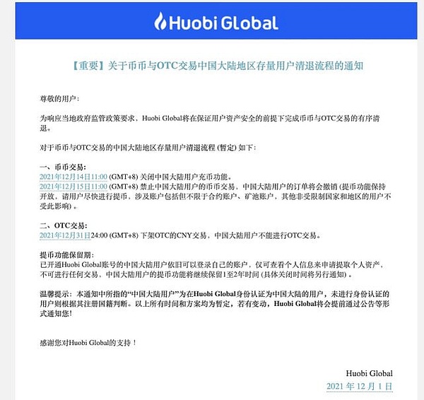 值得关注的是,近日,加密货币交易平台火币开始发布站内信提醒中国大陆用户清退账户资产,明确将于12月14日关闭中国大陆用户的充币功能。12月15日禁止中国大陆用户的币币交易功能,12月31日,将下架OTC交易。