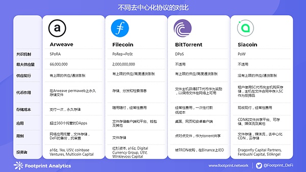 本文以 Arweave、Filecoin、BitTorrent 和 Siacoin 作为项目代表,进行了横向对比总结: