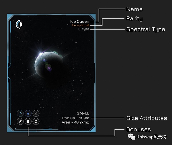 有六类奖励:一种用于每种核心资源,一种适用于小行星可以产生的每种资源。小行星可以拥有这些奖励的任意组合。