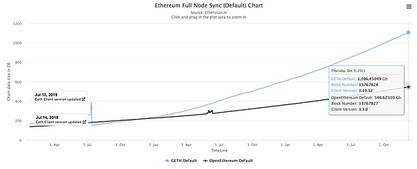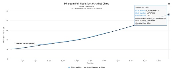 从图中我们可以看出,节点的链数据规模稳步增长,现在已经达到~9TB。由于去中心化区块链的一个目标是允许普通配置的计算机运行节点,因此在普通配置的计算机上强制要求 9TB+ 存储会难以达到。