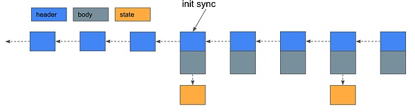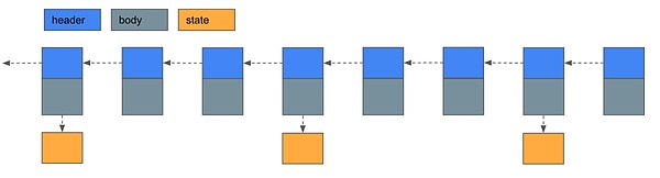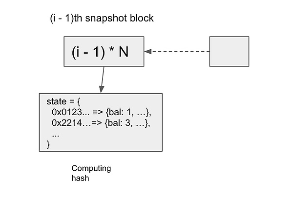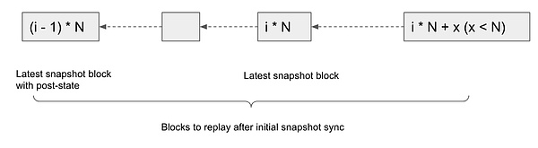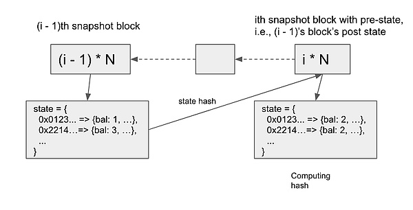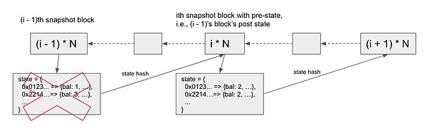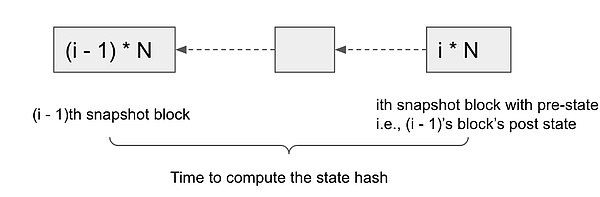 为了启用快速同步,我们有一个周期性的快照区块(快照间隔 = epoch = 例如,14 周)。一个快照区块包含前状态哈希这一附加信息,即前一个快照区块的后状态哈希(执行交易之后的状态哈希):