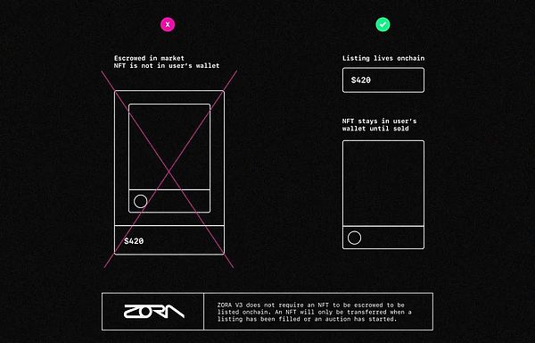 目前当用户上架自己的NFT时,通常需要托管给交易市场。我们在设计ZORA V3时考虑到了用户体验,因此在上架ZORA时,NFT会一直保存在你的钱包里,直到它被买走。