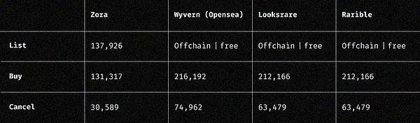 目前,使用ZORA协议购买NFT,要比次优NFT市场(使用Wyvern 协议的OpenSea)便宜39%,尽管OpenSea这些平台在上架NFT时是免费的,但这是以牺牲可组合性和正常运行时间为代价的。