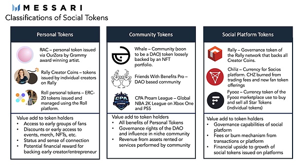 知名研究机构Messari一份报告将社交代币分为三类:个人代币、社区代币、社交平台代币。这也是目前最主流的社交代币分类: