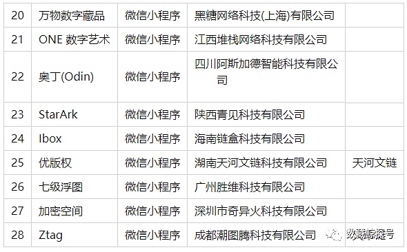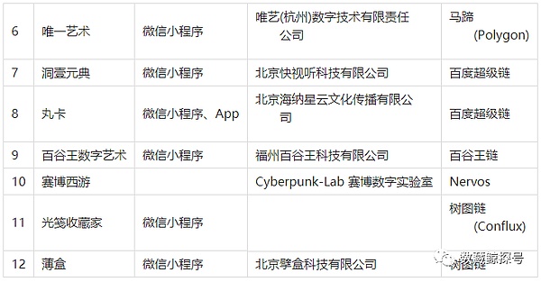 第一梯队有 8家,分别为:鲸探、幻盒、灵稀数字藏品、嗨易购、红宇宙、洞壹远典、红洞数藏、丸卡这八家平台背后都有上市公司的身影。第二梯队有 6家,分别为:唯一艺术、归藏、雀巢文观、蓝猫数字、优版权、IBOX。第三梯队有 25家。具体名单如下: