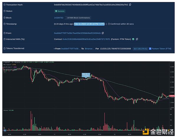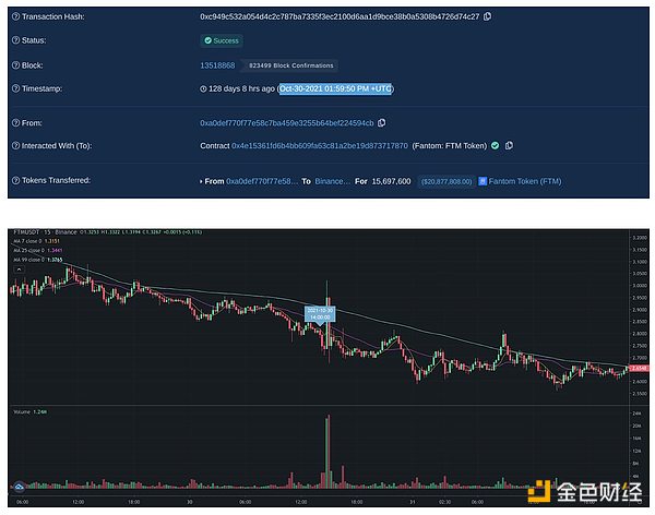 2021 年 10 月 30 日,0x431钱包向币安发送了1560 万FTM代币(价值2080 万美元),然后在接下来的24个小时内,FTM代币的价格下跌了7%。
