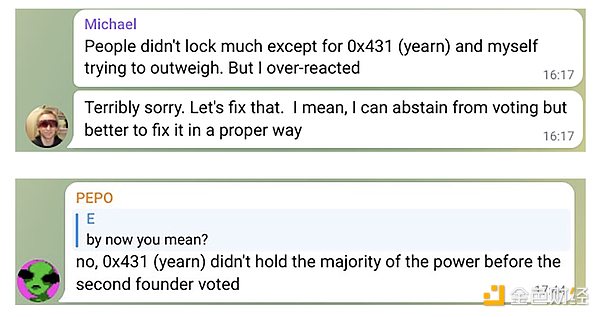 我们在 Lobster DAO Telegram 群中搜索了该地址,发现Curve 创始人 Michael 和Yearn 铁杆粉丝 PEPO于 2020 年 8 月发布了以下消息。