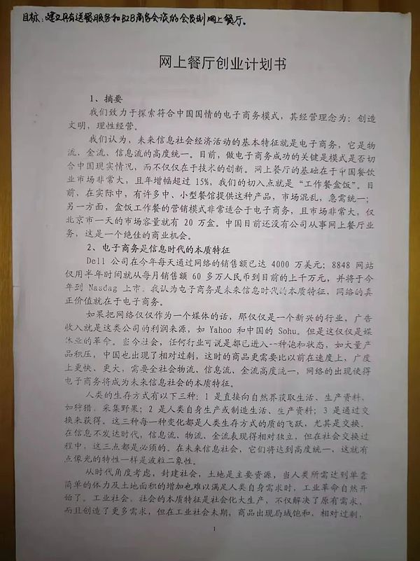 今天整理以前的资料,看到了自己在1999年写的“网上餐厅”创业计划书,现在发现这份商业计划书就是后来的网上订餐线下配送,即饿了么和美团外卖的商业模式,饿了么开始做的时间是2008年,最早也是PC网页订餐,后来因为移动互联网兴起而爆发,可以说网络订餐能爆发其实就是移动互联网的爆发,是本地生活服务类电商的爆发。