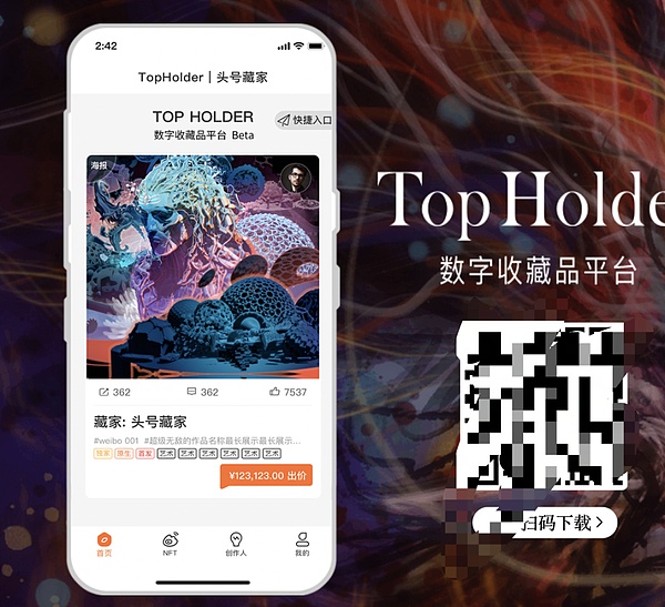 这个平台捆绑微博,面向社交自媒体,同时链接了一款叫做虹宇宙的元宇宙概念app,相互打通,玩家可以在Topholder 购买藏品,放在虹宇宙的虚拟展厅当中。