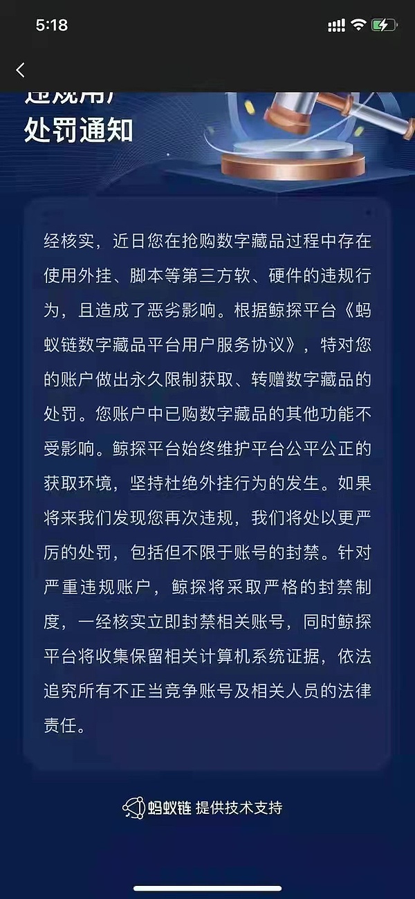 “经核实,近日您在抢购数字藏品过程中存在使用外挂、脚本等第三方软、硬件的违规行为,且造成了恶劣影响。根据鲸探平台《蚂蚁链数字藏品平台用户服务协议》,特对您的账户做出永久限制获取、转赠数字藏品的处罚。您账户中已购数字藏品的其他功能不受影响。鲸探平台始终维护平台公平公正的获取环境,坚持杜绝外挂行为的发生。如果将来我们发现您再次违规,我们将处以更严厉的处罚,包括但不限于账号的封禁。针对严重违规账户,鲸探将采取严格的封禁制度,一经核实立即封禁相关账号,同时鲸探平台将收集保留相关计算机系统证据,依法追究所有不正当竞争账号及相关人员的法律责任。”