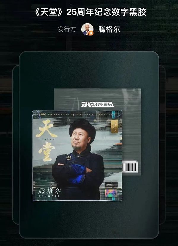 QQ音乐-TME 将于3月25日 17:00 推出腾格尔《天堂》25周年纪念数字胶片,本次将采用抽签的方式进行,感兴趣的用户可QQ音乐搜“数字藏品”进入平台参与抽签。