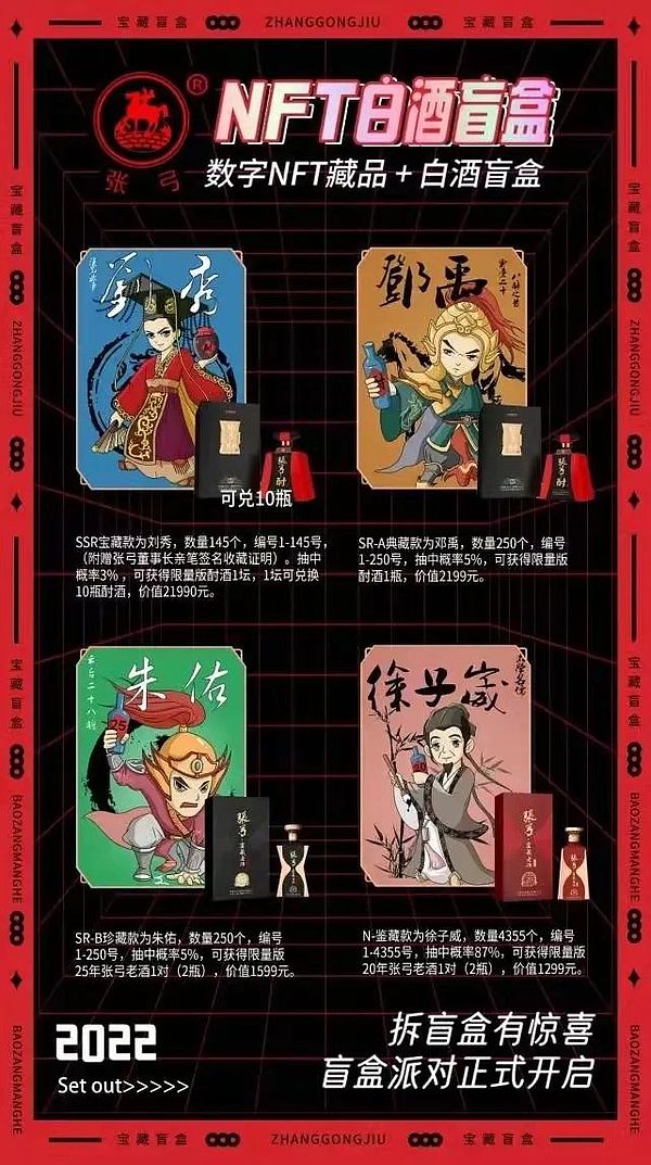 张弓酒类于近日推出《NFT白酒盲盒-刘秀“英雄崛起”》(数字藏品+收藏级实物白酒)共1款数字藏品,本次发行4款,即日起可在淘宝“张弓酒类旗舰店”预售购买。