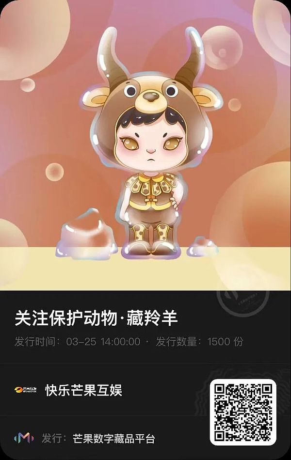 芒果TV将于3月25日 14:00、20:00推出《关注保护动物系列》《角色纪念卡》共2款数字藏品,本次将发行4幅作品,芒果tv搜“数字藏品”可进入平台购买。