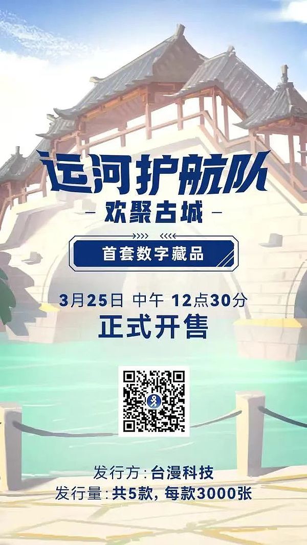 功夫数字将于3月25日 12:30联合山东台漫推出大运河超级IP《运河护航队·欢聚古城》共1款数字藏品,本次共发行5幅作品。