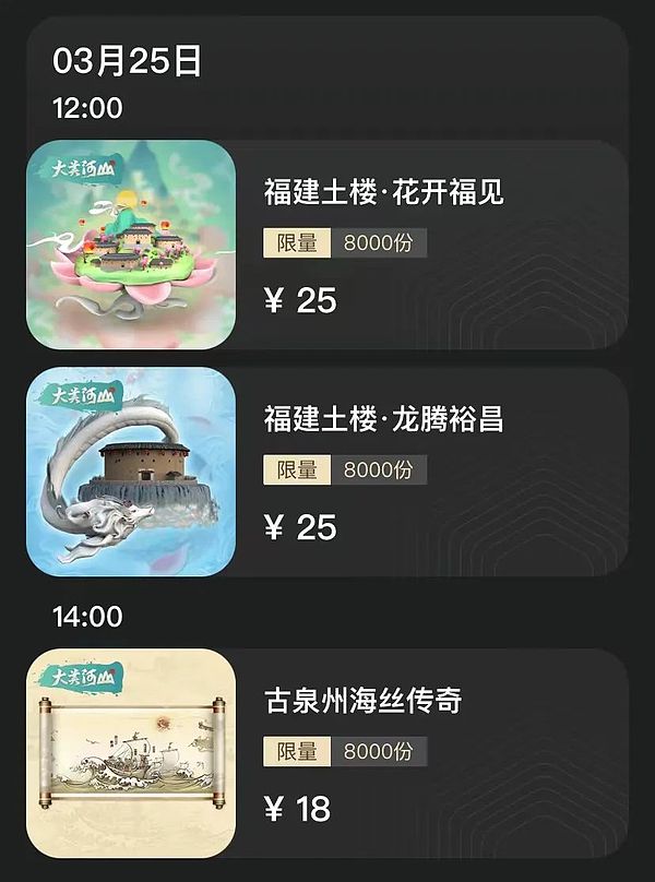 鲸探 APP将于3月25日 12:00 14:00推出《福建土楼·花开福见》《福建土楼·龙腾裕昌》《古泉州海丝传奇》共3款作品。