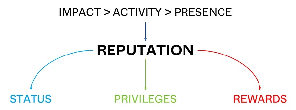 但我相信,成员的交叉背景和多样化的技能会为社区的发展赋能。扁平化社区通过对成员的多样化贡献设立认可和奖赏机制,可以激励更多成员参与进来,实现包容性发展。有别于专项排行榜或单维的积分系统,这一模式可以吸引成员参与更多样的活动,担任各式角色,并获取相应的"徽章"。社区将徽章或代币认作一种"社会信号",用以表征成员的特定贡献或成就。同时,它们还会与一些权限和特权挂钩,比如,部分功能和福利仅供达到一定地位或声誉等级的成员享受,以及特定的治理权和身份只向活跃成员和贡献者开放,这本质上赋予了他们更高的地位。