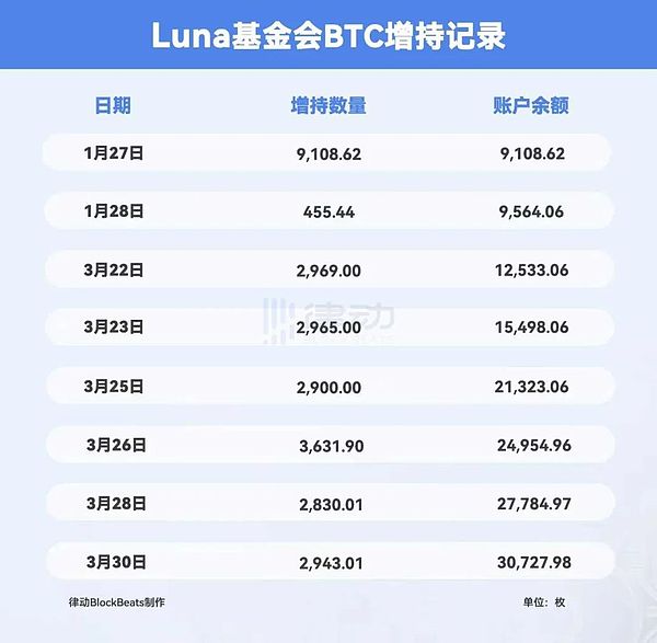 从 1 月 27 日开始,被标记为 Luna 基金会(Luna Foundation Guard,LFG)的地址里比特币持仓量不断增加,平均两天增持约 3000 枚 BTC。