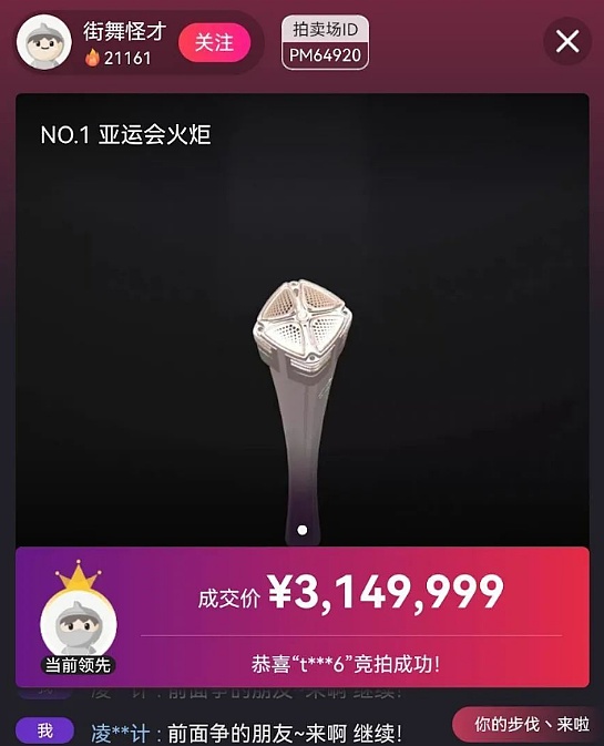 2021 年 9 月 24 日,蚂蚁集团声明称,接网友举报,蚂蚁链与阿里拍卖联手下架一起涉嫌网络欺诈的交易。一位 ID 名为「街舞怪才」的用户在拍卖平台发布「亚运会火炬」的相关竞价信息。蚂蚁链表示,「街舞怪才」在拍卖页面附上了数字火炬藏品的详情图,混淆了数字藏品和实体火炬的差异,对买家造成误导,涉嫌欺诈,因此平台下架对应违规商品并对用户进行相应违规处理。杭州亚运会火炬 NFT 限量发行 21000 份,售价 39 元,但在当时场外被爆炒至 300 万元,围观人数超过 1.5 万人。