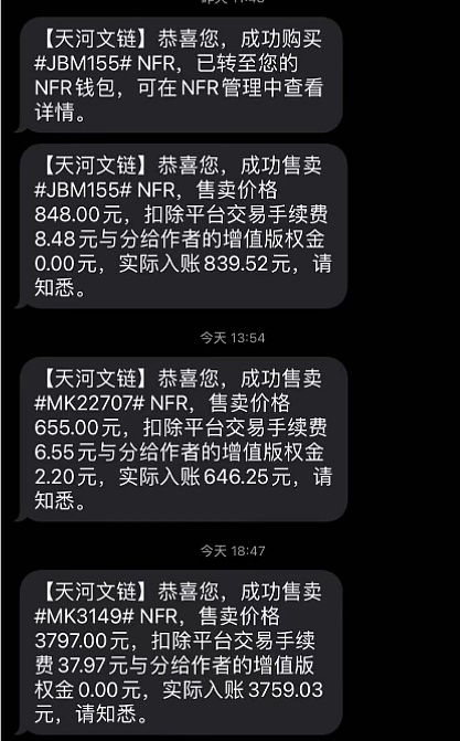 公开交易平台的消失更激发了玩家的斗志,玩家们组建了场外交易群,「飞天」的数字藏品从几千炒到了上万,不同的号码还有不一样的叫价。「昨天我卖了 7500,今天已经 1 万了,少赚 2000 多。」一位获利 750 倍的玩家还有些遗憾。