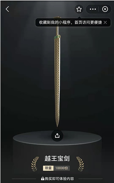 而这只是她拥有 50 多个藏品中的一件,平时闲暇时,她会打开数字藏品平台,放大、缩小仔细观看藏品上的细节。如果是 3D 作品,还可以旋转观赏。通过 3D 技术,人可以极近距离地看到一把 3D「越王宝剑」上的纹路、宝石、刻字,「差距仅仅是无法真实触碰而已。」