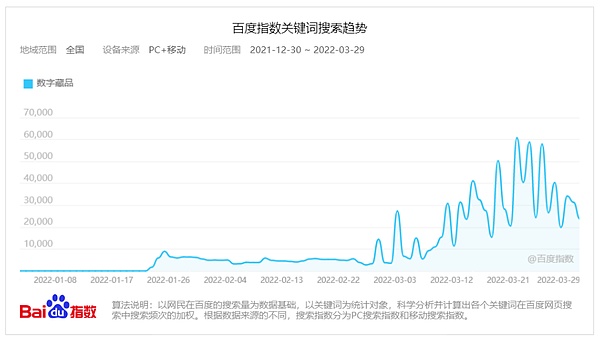 数字藏品的发行,不难看到的是有很多权威机构背书和顶级 IP 加持的。前有央视网和证监会法定媒体《上海证券报》入局数字藏品,增强了消费者的投资信心。后有春节期间蚂蚁链的数字藏品平台鲸探联合 24 家博物馆(院)发行「虎文物」、「十二生肖文物」、「镇馆之宝」等 3D 数字藏品。春节和冬奥盛事双喜相逢,数字藏品作为一种贺喜新形式加速进入大众视野,影响力不断扩大,数字藏品的价值开始被大众讨论。1 月 19 日,数字藏品登上百度热搜第十位,随后数字藏品百度指数飙升。「昨天刚去抽签了丰子恺的数字藏品,这种文物的 IP 估计很难出现在国外的 NFT 上吧?」Jessica 介绍着国内数字藏品的优势。