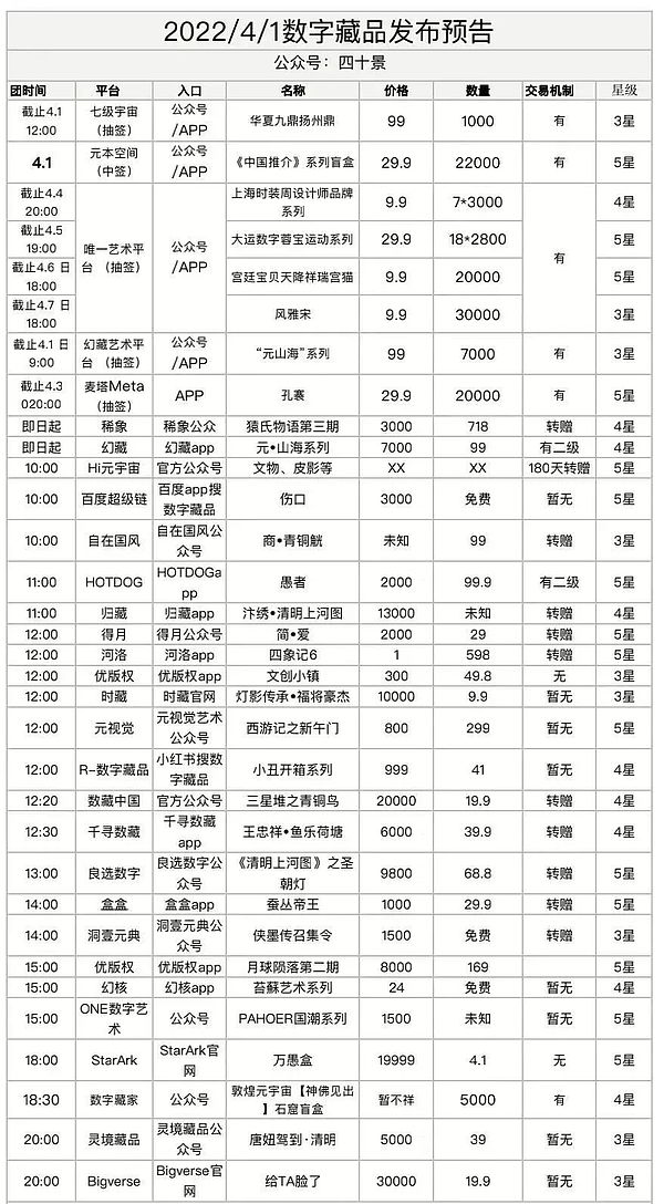 庞大的消费群体造就了这个新市场,律动 BlockBeats 在社群中发现,数字藏品的新项目发布已经按小时为频率统计。仅 4 月 1 日单日,就有 33 个新数字藏品发布,单价 10 元至 3 万不等。有平台甚至为新品做出了详细时间表,并附有推荐指数。炒股炒鞋的那一套玩法,在数字藏品上重现。