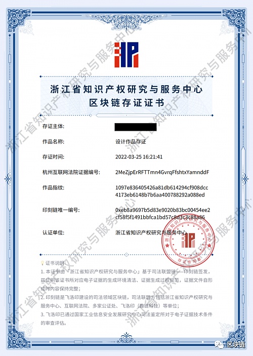 此外,证书基于长三角影响力最大的司法服务联盟链“印刻链”,联合浙江省知识产权研究与服务中心以及链上公证节点共同出具,面向社会提供公开、便捷、权威的区块链知识产权存证确认服务。