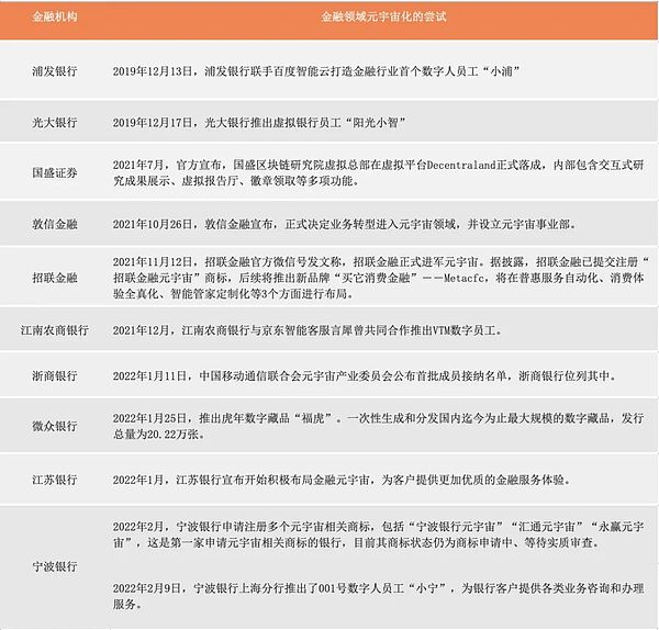 除了上述提到的百信银行和工商银行分行,目前国内许多金融机构已经透露出进军元宇宙的决心,部分机构也已经初步打造相关的元宇宙场景。