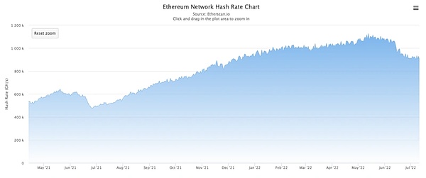 算力的下降,主要是由于 ETH 币价出现断崖式下跌,从 5 月初的 3000 美元一度跌破 1000 美元,最低跌至 880 美元,最大跌幅超过 70%,导致一部分矿机跌破关机价被迫关机。Glassnode 数据显示,5 月 ETH 矿工收入较 4 月(13.9 亿美元)下降 27%,相较于去年同期下降 57%。
