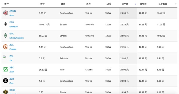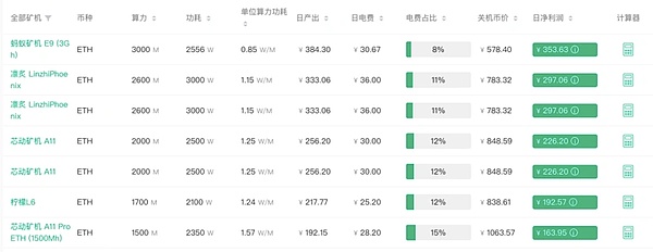 以 E9 为例,antpoolminer 数据显示,其算力可达 2400M,功耗 1920w 远超显卡 RX580 8卡(240 M,1200W),并且单位算力功耗是后者的 1/6;E9 也是目前挖矿收益最高的机器,单日挖矿收益 53 USDT,关机币价为 88 USDT。