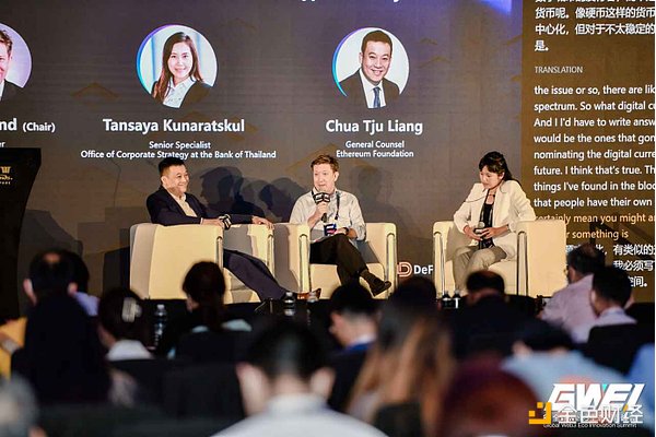在上午进行的圆桌“央行数字货币(CBDC)与加密货币”上,以太坊基金会总法律顾问 Chua Tju Liang、泰国中央银行企业战略部门高级专家 Tansaya Kunaratskul 与圆桌主持人新加坡合规咨询公司 Holland & Marie 合伙人 Chris Holland 就两种数字货币的关系和发展前景进行了精彩对话。
