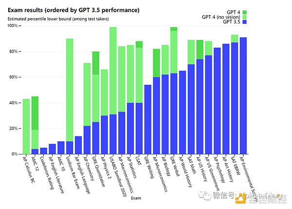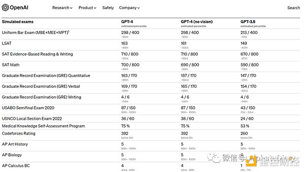 为了理解这两个模型之间的差异,我们在各种不同的基准上进行了测试,包括模拟最开始那些为人类设计的考试。通过使用最新的公开测试(就奥数和AP等等考试)还包括购买2022-2023年版的练习考试来进行,我们没有为这类考试给模型做专门的培训,当然,考试中存在很少的问题是模型在训练过程中存在的,但我们认为下列结果是有代表性的。