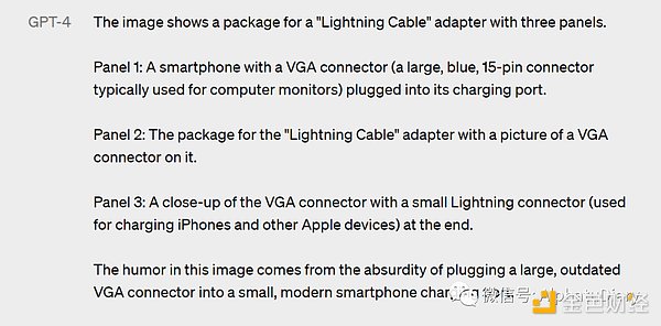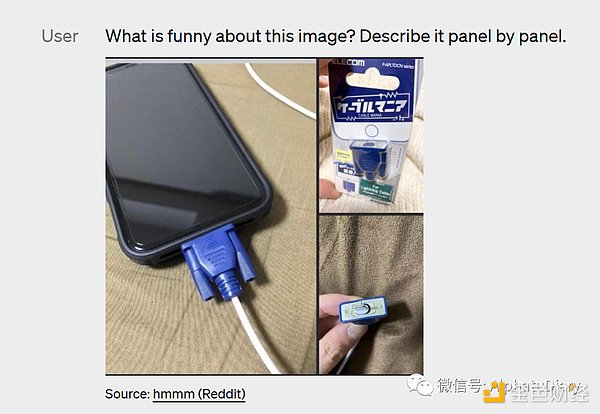 GPT-4能对相对复杂的图像进行说明和解释,比如说,从插入iPhone的图片中识别出一个Lightning Cable适配器(下文有图片)。