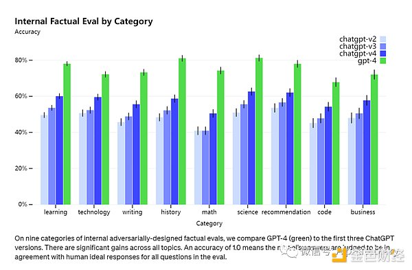 尽管各类情况仍然存在,但相较于以前的模型(这些模型本身也在不断改进),GPT-4大大减少了hallucinations(意思是网络错觉,这里指的是一本正经的胡说八道)。在我们内部的对抗性事实性评估中,GPT-4的得分比我们最新推出的GPT-3.5高40%。
