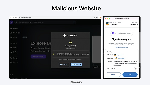 打开一个Zapper的恶意广告,可以看到他试图利用Permit签名获取我的 $SUDO的授权。如果你安装了Scam Sniffer的插件,你会得到实时的风险提醒。