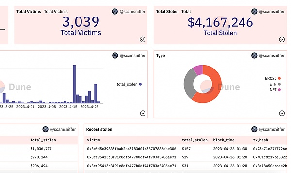 为了分析潜在的规模,我们从ScamSniffer的数据库里找到了一些和这些恶意广告网站关联的链上地址。通过这些地址分析链上数据发现,一共大约 $4.16m被盗,3k个受害者。大部分被盗发生在近期一个月左右。