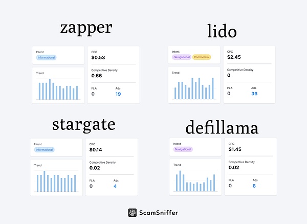通过分析了部分关键词,我们定位到了一些恶意的广告和网站,如Zapper, Lido, Stargate, Defillama等。