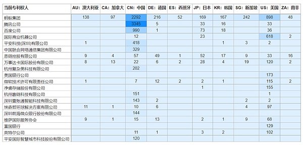蚂蚁集团专利授权量全球排名第一,且布局最为广泛,中国授权2292件、美国授权898件、新加坡授权242件、德国授权216件、日本授权169件、韩国授权167件、澳大利亚授权138件、加拿大授权97件。腾讯公司已获得授权的专利中,中国授权3345件、美国授权33件、日本授权33件、韩国授权16件、德国授权5件。百度公司已获得授权的专利中,中国授权990件、日本授权73件、美国授权36件、韩国授权18件、德国授权1件。IBM已获得授权的专利中,美国授权618件、日本授权23件、中国授权12件。英国恩链、美国微软、美国万事达、爱尔兰埃森哲、美国维萨等国外企业,虽然专利授权量不高,但全球布局较为广泛。