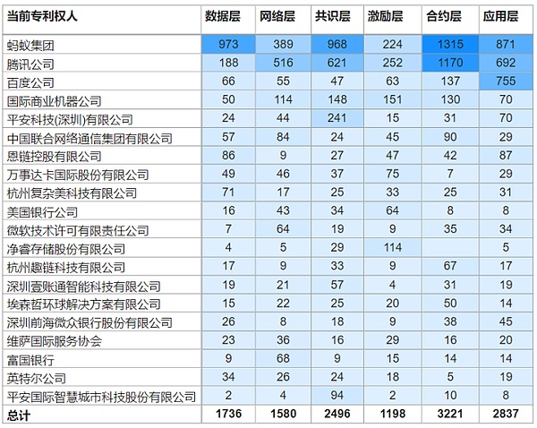 通过对区块链主流技术架构层下的专利授权量统计发现,蚂蚁集团和腾讯公司已包揽各主流技术架构层专利授权量的全球第一。其中,蚂蚁集团数据层专利授权量973件、共识层专利授权量968件、合约层专利授权量1315件、应用层专利授权量871件、网络层专利授权量389件、激励层专利授权量224件,数据层、共识层、合约层和应用层专利授权量位居全球首位,重点布局数据结构、加密机制、权限管理、计算资源等相关技术。腾讯公司网络层专利授权量516件、共识层专利授权量621件、合约层专利授权量1170件、应用层专利授权量692件、激励层专利授权量252件、数据层专利授权量188件,网络层和激励层专利授权量位居全球首位,重点布局智能合约技术等。
