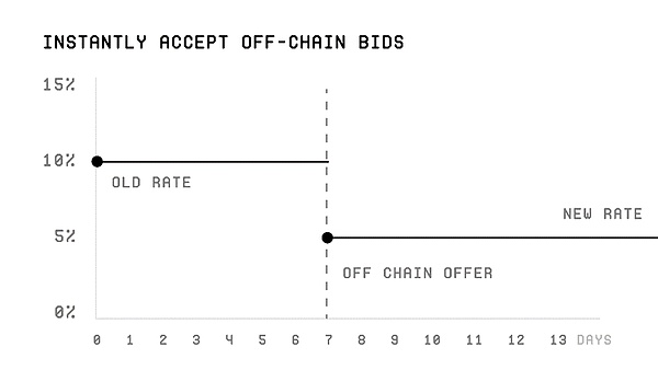 当到期时间临近且借款人尚未偿还债务时,以0%利率开始再融资拍卖,并逐步提高利率。一旦拍卖达到新资金方感兴趣的利率水平,新资金方即可在链上提交报价以接受交易。新资金方按照拍卖结束时的偿还金额(可计算为当前到期时间加上协议规定的贷款期限)向旧资金方支付全部偿还款项,并以拍卖达成的利率接管贷款,直至新的到期时间。