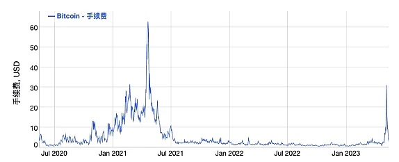 用户使用 BTC 进行交易时,需要付出手续费吸引矿工打包交易,手续费越高,交易确认的速度越快。当交易拥堵时,手续费会变得额外昂贵,在 2021 年一度达到 60 多美金。自 2020 年 5 月 14 日至 2023 年 5 月 15 日,比特币的交易手续费平均需要 4.66 美金。这个手续费成本阻碍了很多用户使用 BTC。