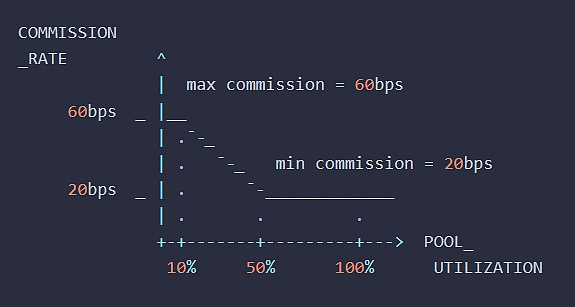 要支付的佣金价值是佣金率乘以期权的数量。当池子利用率低于10%时,佣金费率从60bps开始。当池子利用率达到50%时,佣金费率(线性)降至20bps。当池子利用率高于50%时,佣金费率保持在20bps。佣金费率在低池子利用率时较高,是为了确保即使交易活动较低,Panoptic流动性提供者也能获得合理的收益。